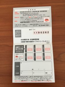 専用応募はがきが、麻婆豆腐の素の箱の中に入っていたので、別途ハガキを用意する必要がなく、62円切手を貼るだけで、応募出来ます。