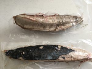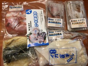 かつおの塩干し・あじのみりん干し・かますの開き・さばのみりん干し・鯛の干物・イカの一夜干し、が冷凍品で届きました。