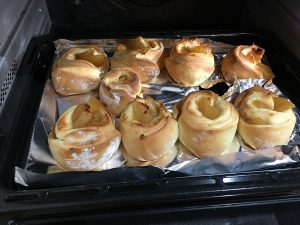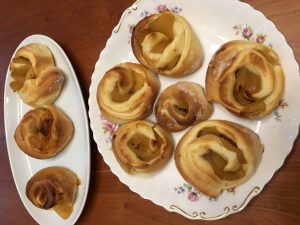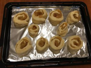 リンゴのコンポートを、パン生地に並べて、くるくるっと巻き寿司のように、巻きます。