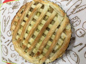 パイ皿に、バターを塗り、冷凍パイシートを貼り付けます。